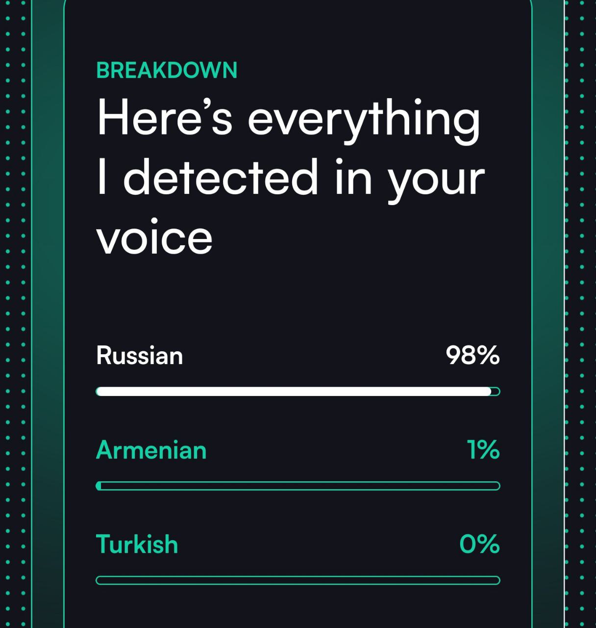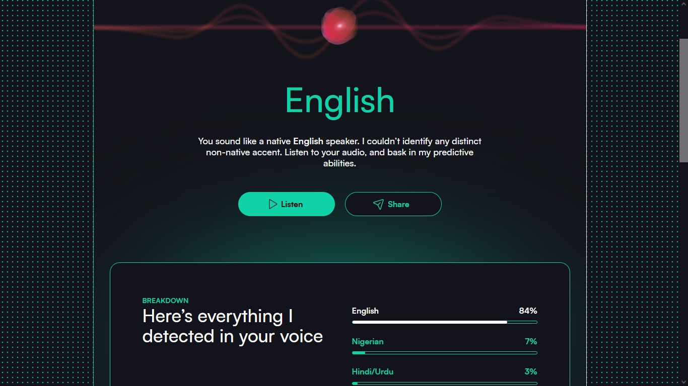 >>716300 Пару лет назад я пользовался приложением ELSA speak целый год по подписке. Получал топовые баллы, отрабатывал всё до идеала. Сейчас прошел этот тест - 100% русский акцент.