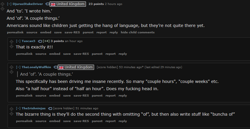 >>716841 >awkward в гугол транслейте который с британским произношением звучит условно как "оукват" в гогол же переводчике в браузере который с американским произношением - как "аквард", с довольно явной "а" с четким ударением на нее в начала и "рд" в конце Думаю, такими темпами лет через 50 бритахи и пендосы перестанут понимать друг друга. И этому ника не помешать