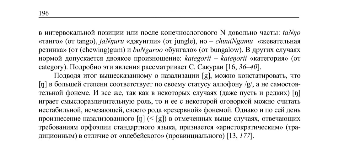 >>714355 >Вот несколько причин, по которым я могу предположить, что это не редукция В литературе обсуждается вопрос фонемной самостоятельности этих согласных. Автор (Рыбин) в работе на скриншоте полагает назализировпнный согласный аллофоном согласного g, подразумевая, что его оппоненты считают этот согласный отдельной фонемой. И в том, и в другом случае о редукции речь как бы не должна идти. Поэтому похоже, что ты таки прав...