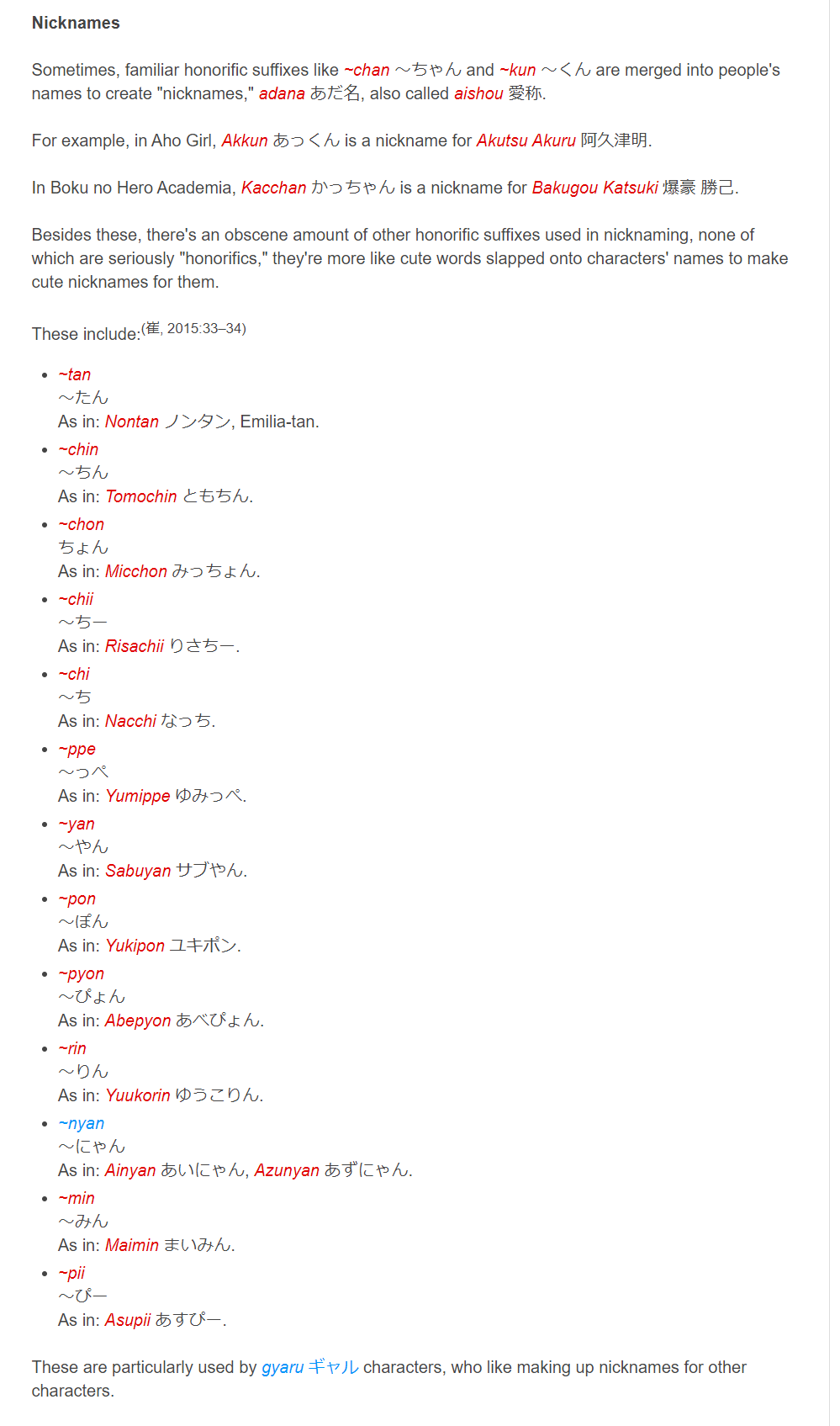 >>714615 Вот тут еще варианты, которые в других местах не описаны: https://towanomirai.proboards.com/thread/23/creating-japanese-nicknames-petnames Что интересно, я ни разу не встречал сколь-либо академического описания этого явления, паттернов употребления, с какими именами обычно юзают какие суффиксы и т.п. Похоже, оно настолько неформальное, что лингвистам совершенно не интересно.