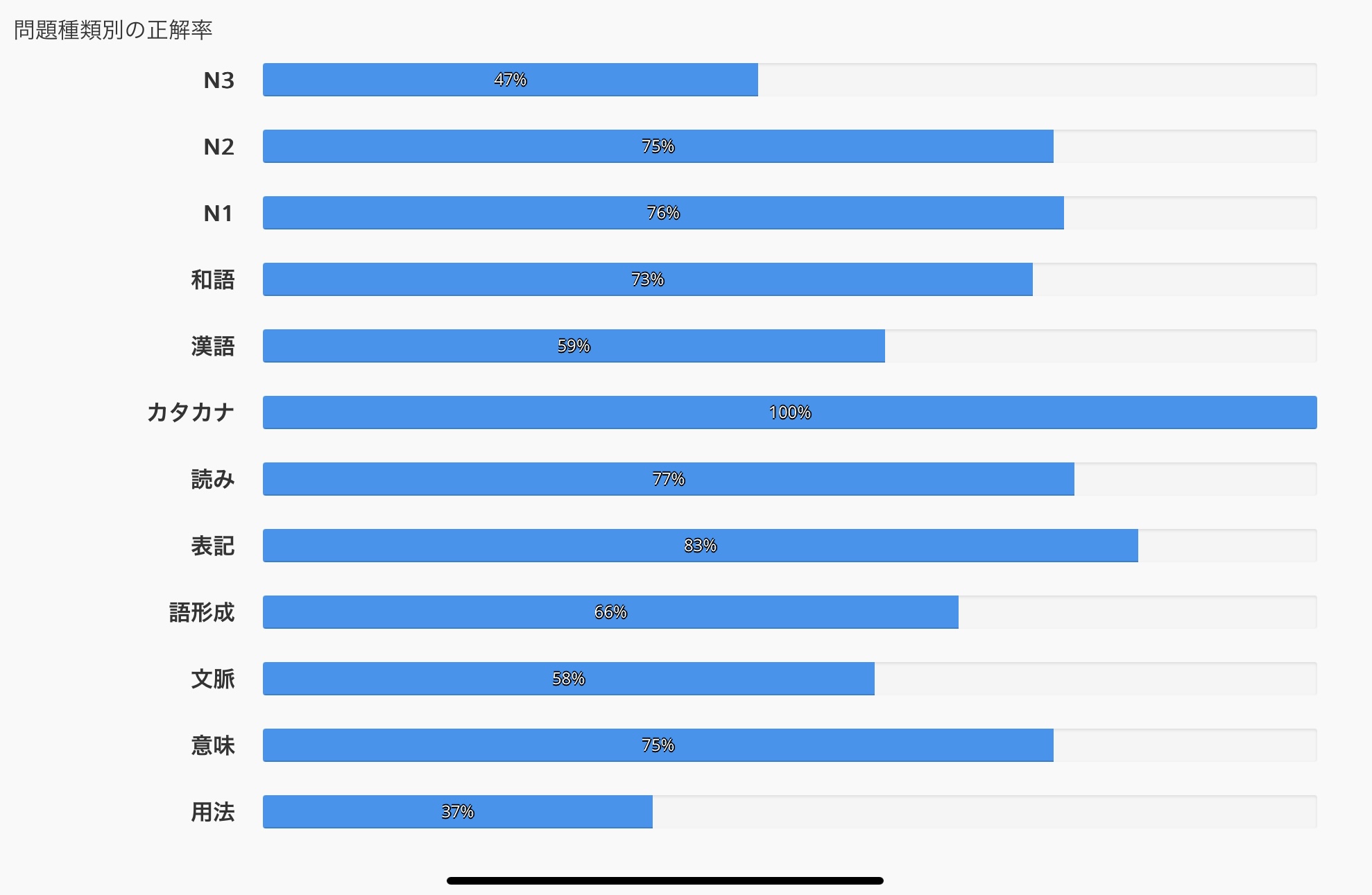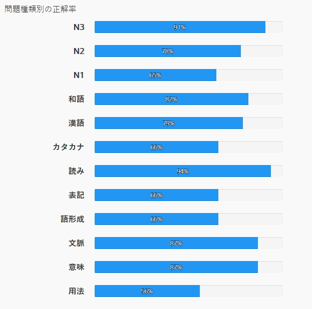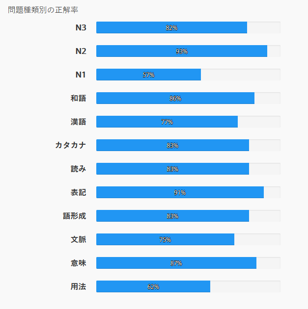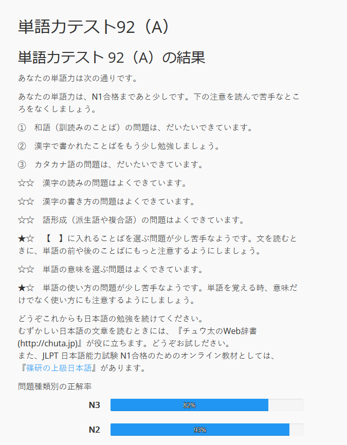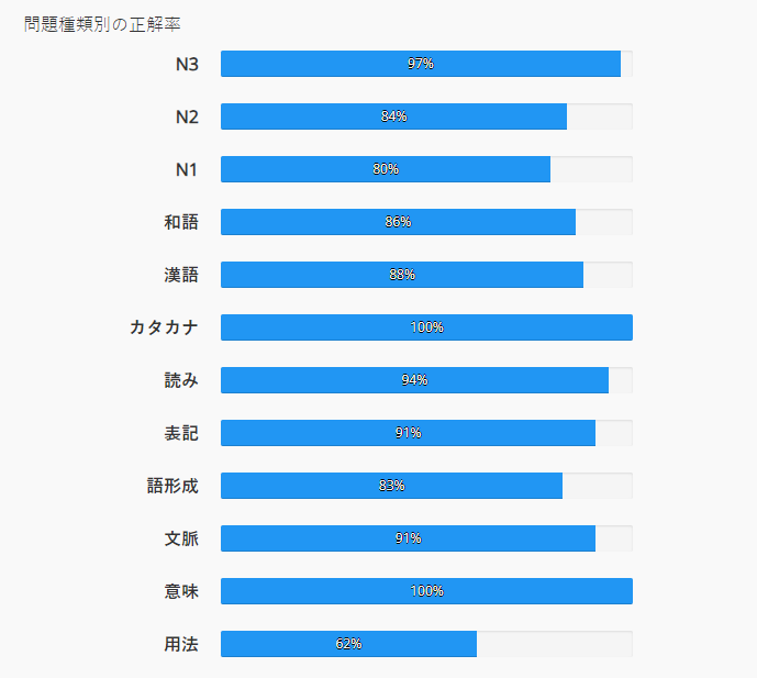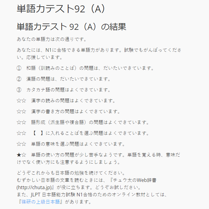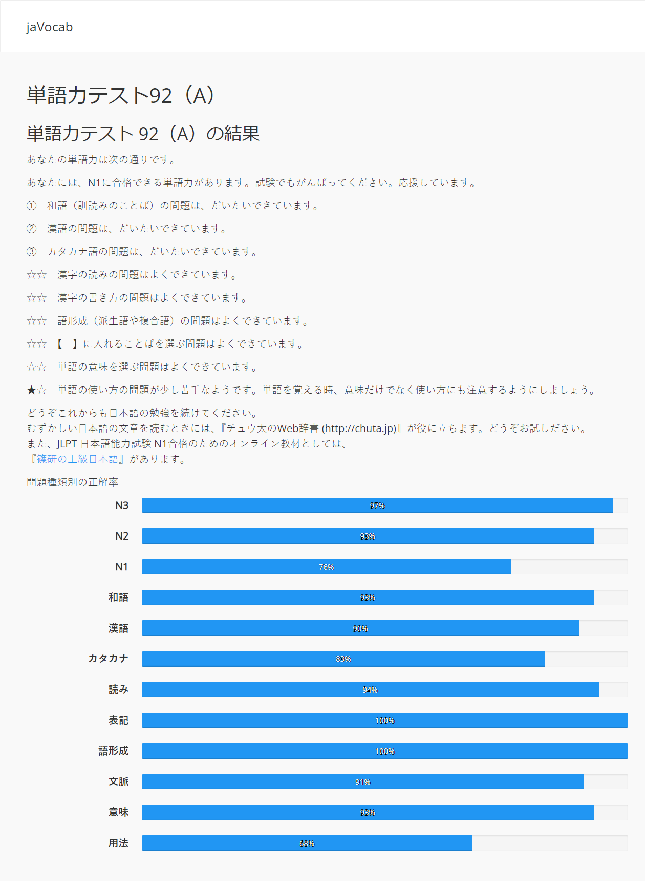 >>714993 Ну в целом вполне ожидаемо, то что проверяет умение самому употреблять слова (用法) в самой жопе, ибо активные навыки не практирую и не планирую. Жалко, что тестик в конце не рассказывает, где же именно я проебался, хотя бы не было пустое убийство времени.