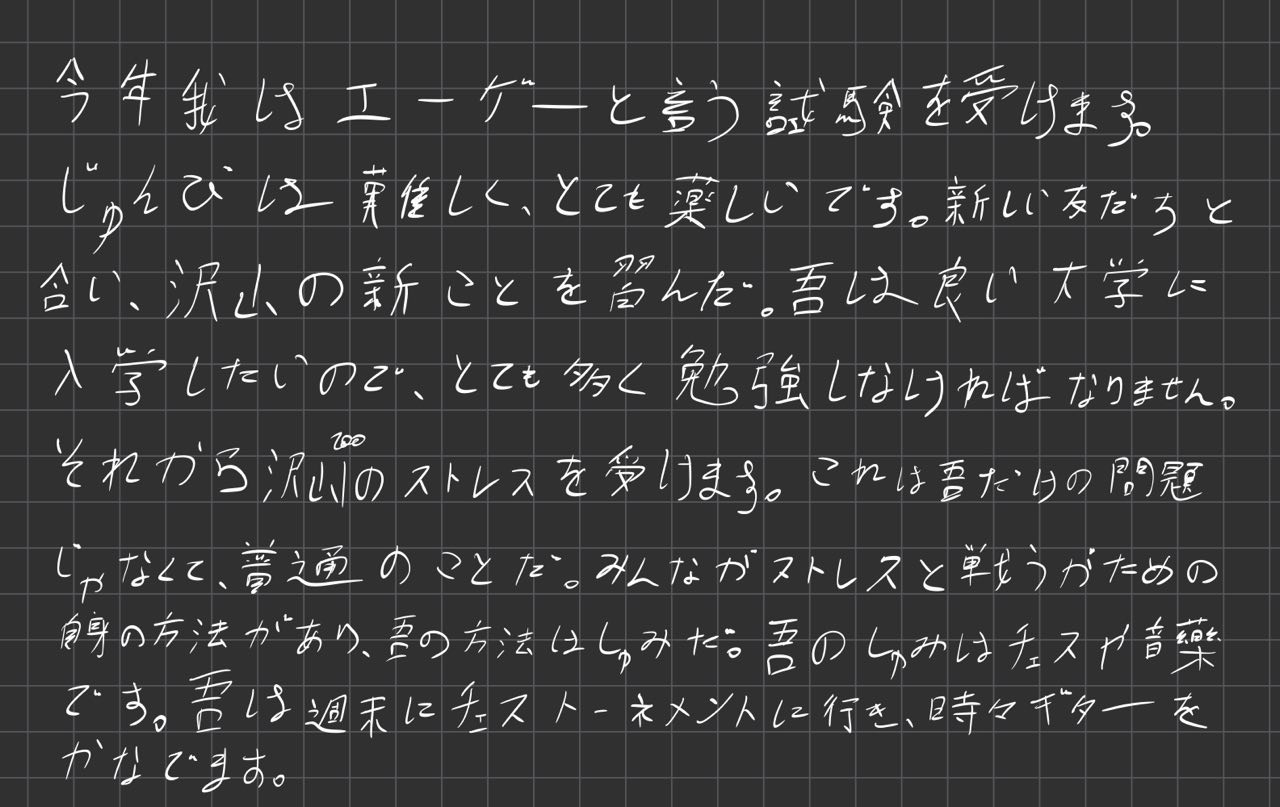 Ну ето круто. У меня есть знакомая китаянка которая знает англ и мы общаемся на англе. И иногда я чет на китаюсике вставляю и обмениваемся короткими голосовыми. Но читать мою пысанину и проверять на регулярной основе я её просить не могу, она заебется. Мы хотим попробовать потом письмами обмениваться ркописными ради приколдеса