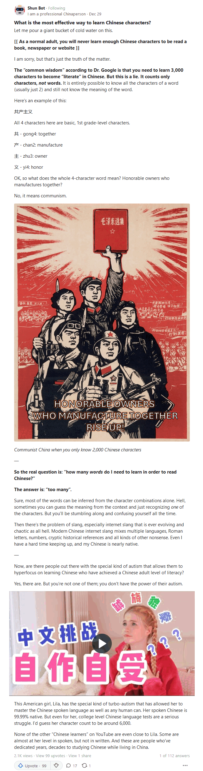 А где можно посмотреть на эту кучку лаоваев? А то просто в целом уровень китайского среди лаоваев довольно низкий. Типа во всяких онлайн школах дохуя преподов с HSK4(то есть А2). Какой-нибудь HSK6 который считается прям огого круто это вяленький B1. Какой-нибудт HSK6 вряд ли осилит прочитать китайский роман. Преподавателей с С1 китайским хуй найдешь и стоить они будут нечеловеческих денег