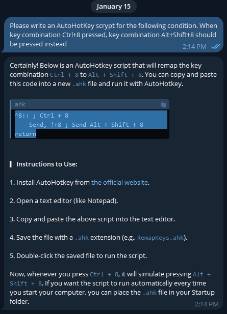 >>719687 >позволяющая биндить чего угодно куда угодно Вдохновляешь, анон. Я вспомнил, что мы в будущем живём. Какое облегчение! Поклянчил, как умел, у роботов соответствующий скрипт для AutoHotKey. Моя версия проги AutoHotKey 1.1.33.00, если что. Текст скрипта для увлекающихся: https://pastebin.com/a6mvPCsF , а то макаба эти строчки любит ломать почему-то.