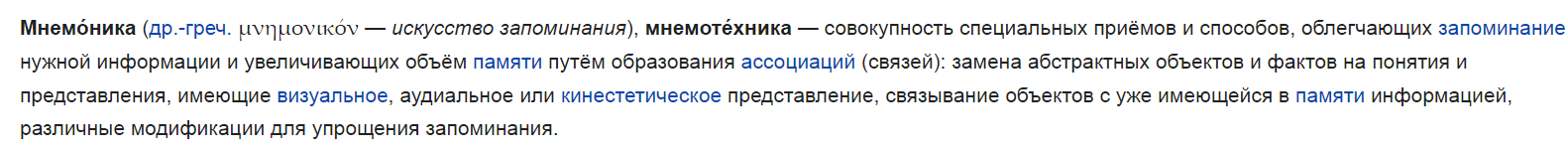 >>719945 > только "мнемоникой" можно назвать и материю, в значении "образ", конкретная ассоциация для запоминания Но это будет не просто ассоциация, специально искусственно высранная ассоциация для облегчения запоминания, получившаяся в результате использования мнемонических техник и приёмов про хуи и жеппы. Если придумывать аналогию на этот счёт, то можно привести такое, что один чел скажет "я просто РАБотал в поле и накачался без всяких ваших качалок", а ты ему ответишь "так физический труд это и есть качалка".