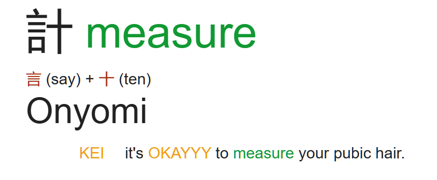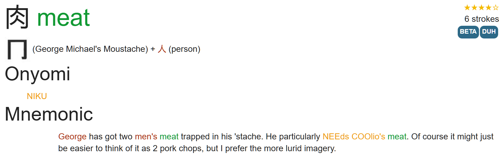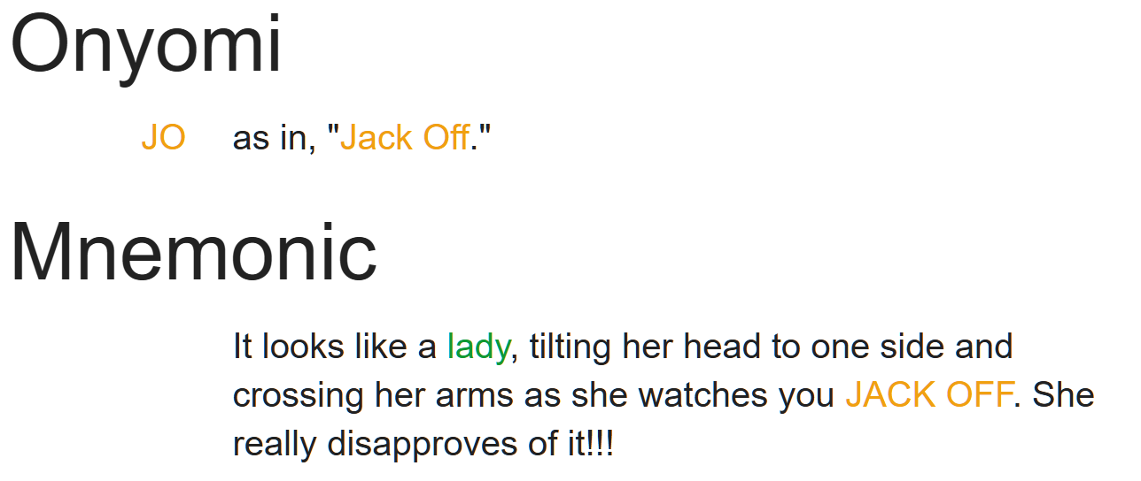 >>719892 Мнемоника это "запомнить любыми способами", в т.ч. через образы никак не связанные с самим словом, мнемоника в контексте японского больше про визуал, и это всегда бредовые высеры только путающие новичков.