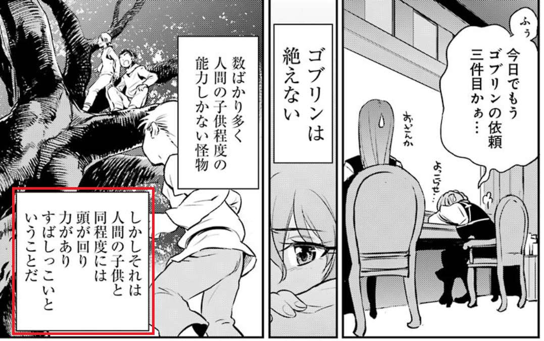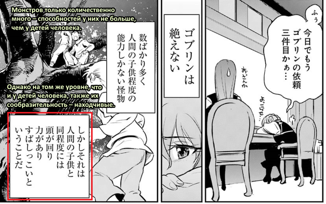 Написано следующее: 1. - Гоблины как тараканы, не извести, впечатляют только количеством, а так не ровня бойцам-приключенцам, силенок (способностей) только на уровне человеческого ребенка. 2. - Однако это значит, что, как и у человеческого ребенка, достаточно хитрожопости, силы (физической) и пронырливости с которыми у взрослых вечно головная боль. (и даже картинка нарисована как дети лазят по деревьям, очевидно, что с такими не очень удобно сражаться)
