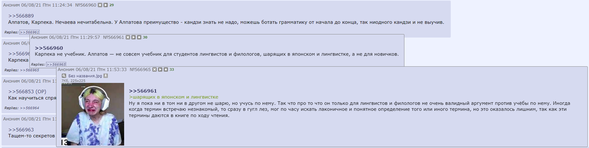 >>723926 Кто-то хейтит анки, кто-то не согласен с тем как другие используют анки, кто-то учит в анках кандзи, кто-то сразу слова, кто-то вообще сначала радикалы и придумывает мнемоники. Кому-то недоступны генки с тобирой из-за незнания английского, кто-то просто предпочитает другие учебники, кто-то ненавидит учебники и им подавай видеоуроки, кто-то предпочитает приложения для изучения. Кто-то что надо дрочить до н1 включительно, кто-то считает что достачтоно пробежаться по начальной грамматике и можно в контент, а кто-то даже начальную не хочет. Кто-то считает что надо просто читать объяснения грамматики, а кто-то что надо делать упражнения. И тому подобное.