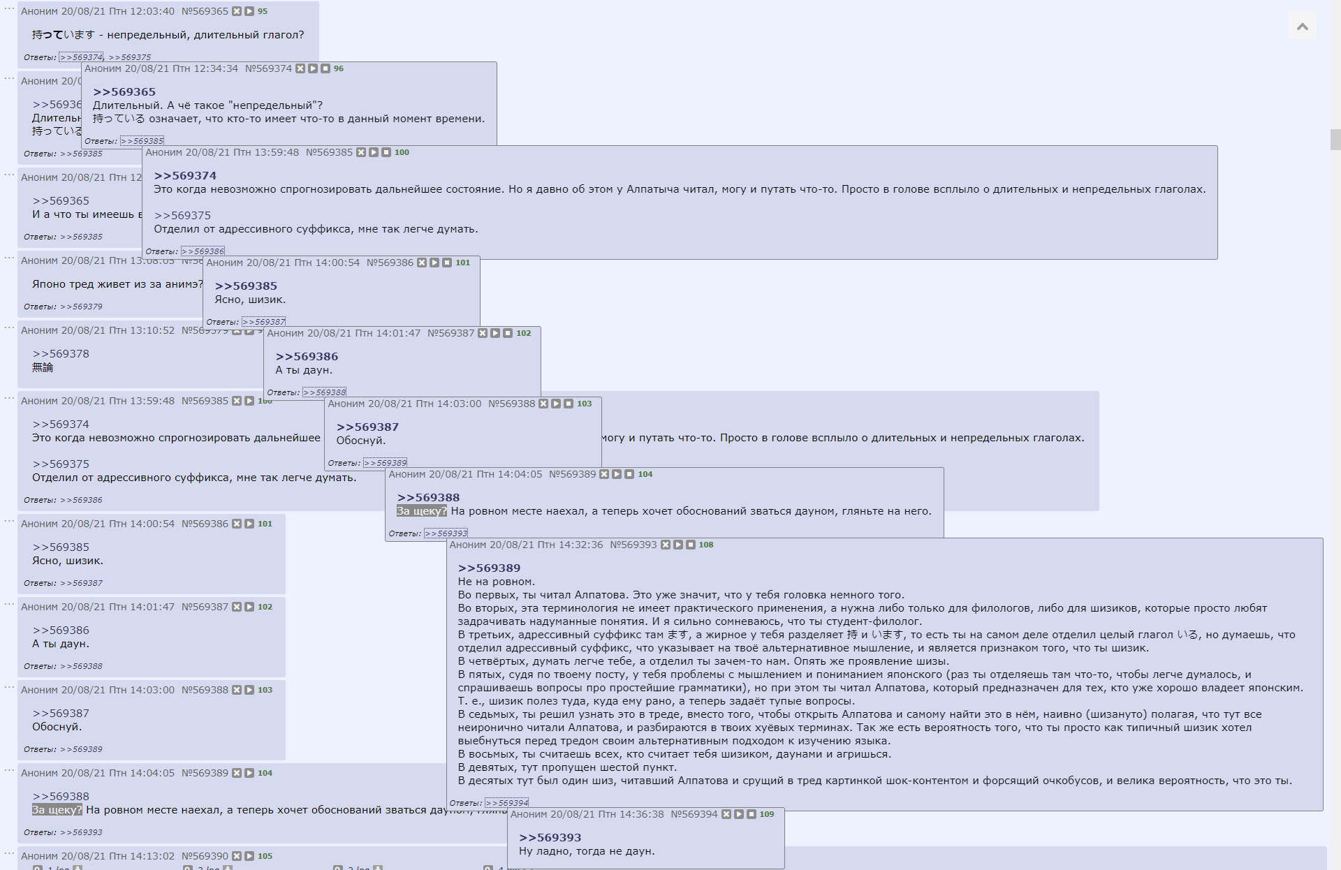 >>723893 А, ну на этих скринах меня нету, но зато прослеживается мое косвенное влияние, что куда круче, лол. А почему ты не объединяешь перечисленных >>723887 в одну папку, ведь это очевидно один челик? >>723894 Ну да, просто одно время тут было модно постить рандомные лингвистические термины тупо как баззворды. Кроме вечно популярного словечка "предикативный" тут еще всякие другие любили, я некоторые уже забыл даже.