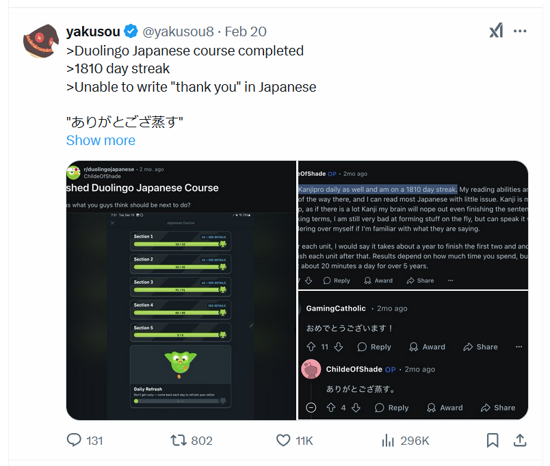 Тебе в твоём анкикале ошибки принести или что? Дуолинга не про письменность, ещё раз повторю для дебила. Ровно так же дрочение колод не про письменность. Если ты только Дуолинго/анки юзаешь и думаешь что выучишь язык - ну это олигофрения.