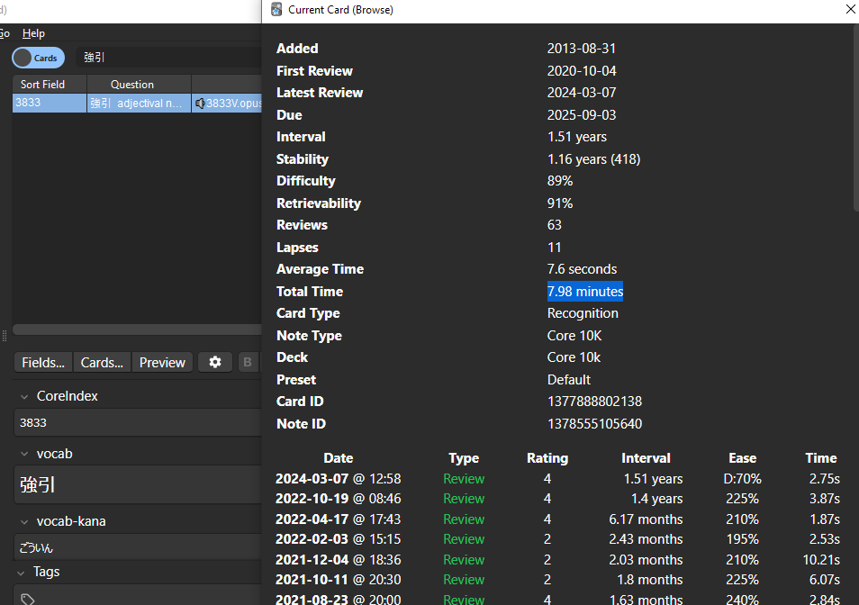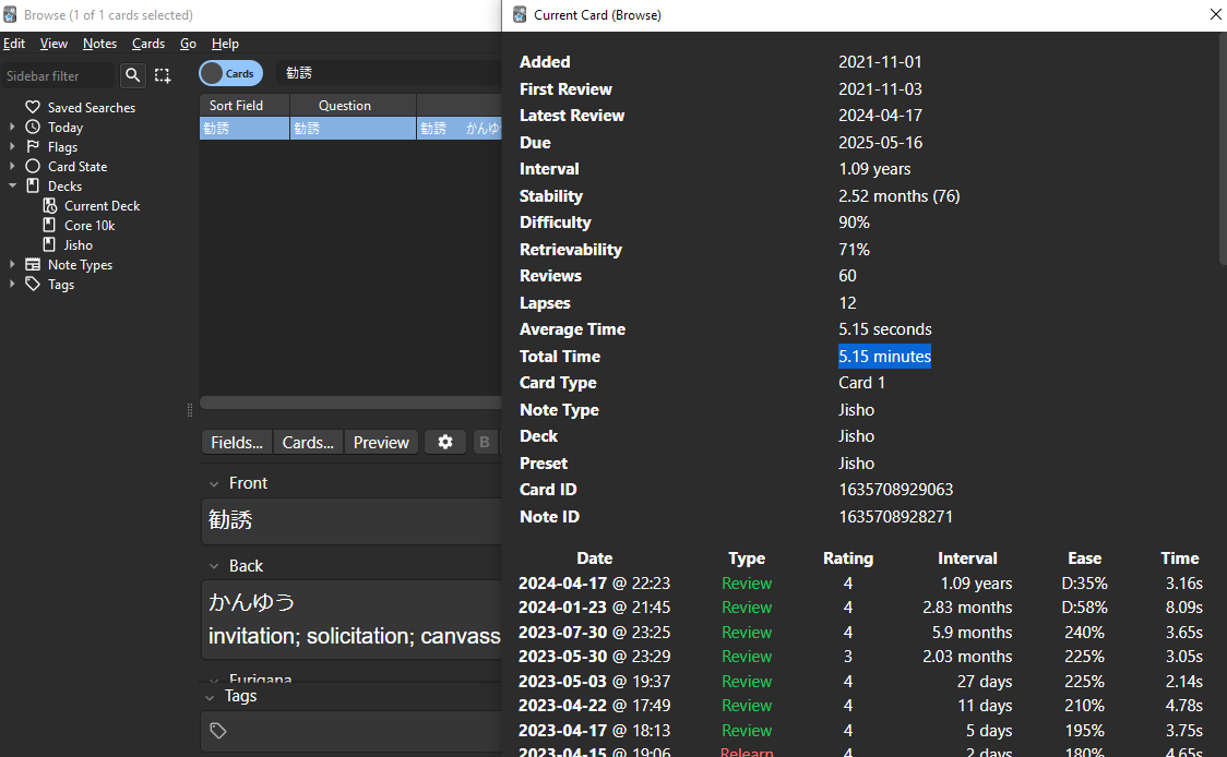 Хотел спросить у 10к куна, сколько он тратил время на запоминание каждого слова по очертаниям? Вот я к примеру встретил словаа 勧誘 и 強引, я нисколько не трачу время на запоминание самих иероглифов так как уже давно их знаю и чтения знаю, ну разве что 勧誘 - запомнить русское значение, 強引 - тоже запомнить русское значение и чтение go. А вот у тебя сколько времени и сколько дней в анках занимало запоминание этих или любых других слов в начале прохождения колод. Если ты прям сразу по очертаниям иероглифы запомнил и за 2-3 повторения слова запомнил, и потом не надо было десятки раз ревью с ними делать то ты какой-то уникум.