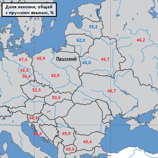 - в прусском и раннем праславянском дифтонг ei, соответствующий восточнобалтийскому ie; - местоимения образуются тем же суффиксом, как и славянские - mais, twais, swais/*mojь, tvojь, svojь < måis, twåis, swåis, в отличии от восточнобалтийских mano, tavo и т.д. - глагол "быть" в 3 л. ед. ч. аориста - bē, как и в праславянском, при восточнобалт. buv-