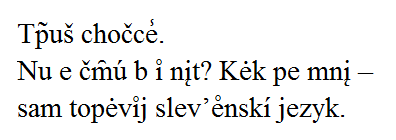 1. Joj, ma kej je dns tu kafe t'ku sltku! 2. Kej me hnjav'š lih ku sm wnh s p'sm! 3. Kej si vidu mačko, ku je šla nan đjro po strjhi? 4. Učjra j an n'wnč skwaču ss strj'he.