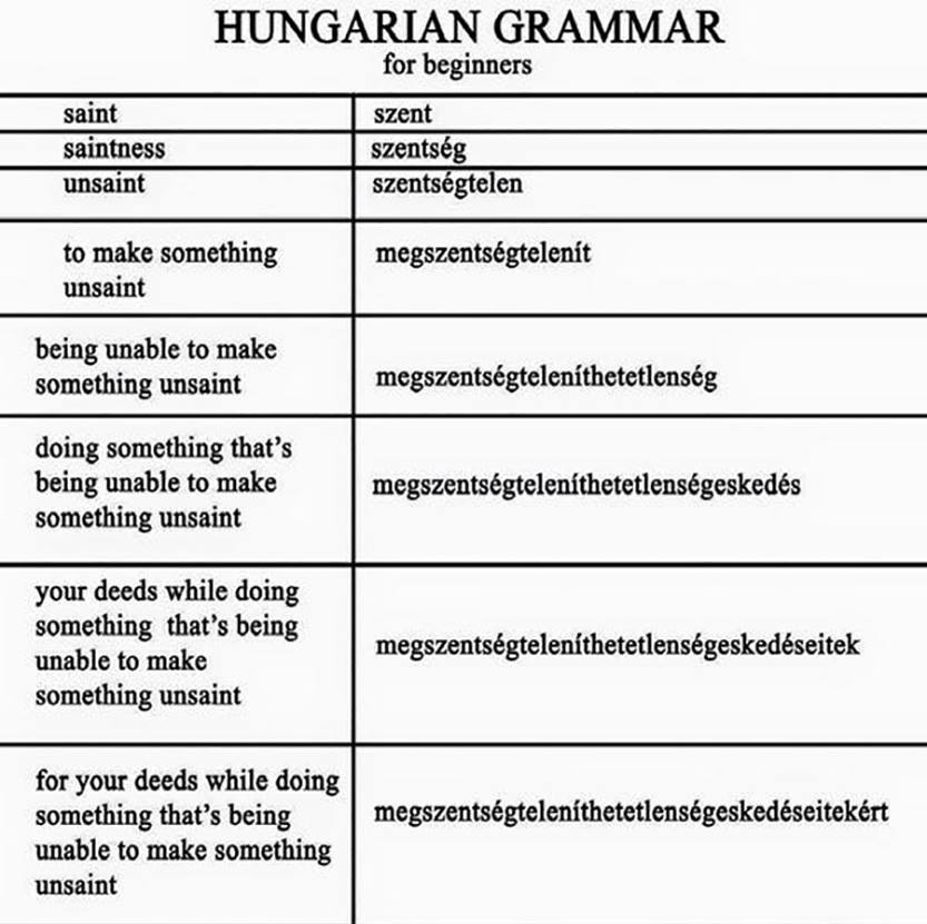 Венгерский - полисинтетический? Дохера слов, которые целым предложением переводятся, типа napfényhiány - недостаток солнечного света или félreértettelek - я тебя неправильно понял.