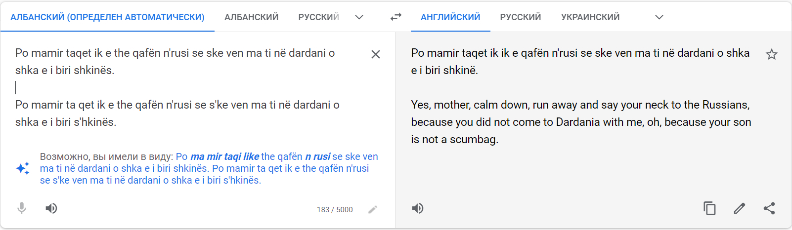 Взял комментарий из инстаграма (сам дурак, понимаю), гугл ожидаемо подавился. Расставил инстинктивно пробелы и апострофы - ебать, да там осмысленный текст. С такими нативами никакой надежды на ИИ, придётся самому всё учить. Печёт.