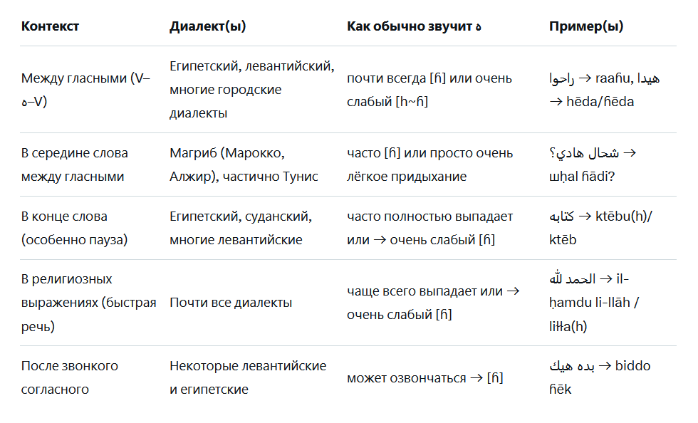 Кратко: самые типичные случаи, когда ه → ɦ 1. Между двумя гласными (особенно в разговорной речи) → самая частая ситуация в египетском и левантийском 2. В очень быстрой, расслабленной разговорной речи → почти во всех городских диалектах Ближнего Востока 3. В магрибских диалектах (особенно марокканский/алжирский городской) → ه часто звучит именно как мягкое звонкое придыхание [ɦ]