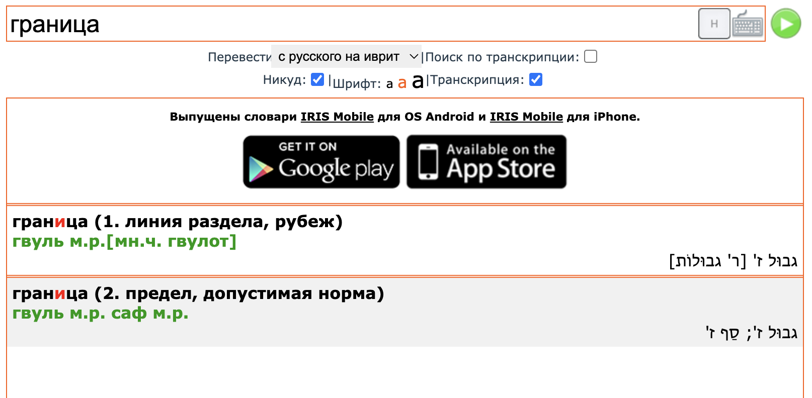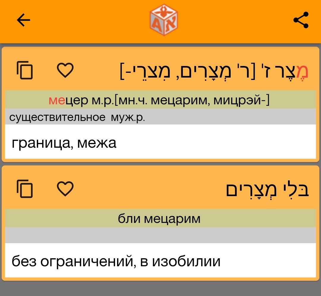 >>672677 Хоть до Песаха ещё далеко, всё равно спрошу : В иврите есть слово מצרים Ещё есть очень похожее по звучанию слово - что то типо мицхаим или мицарим, означающие внутренние пределы, границы. Но я не могу его найти! מצחים - лбы לְהַגבִּיל - предел Cмысл в том что слова Египет и граница созвучны не просто так, у каждого из нас свой "Египет" и мы постоянно должны из него выходить. У Махараля если не ошибаюсь есть фраза с этим словом с таким смыслом в контексте Песаха. Буду благодарен если подскажешь как пишется это слово