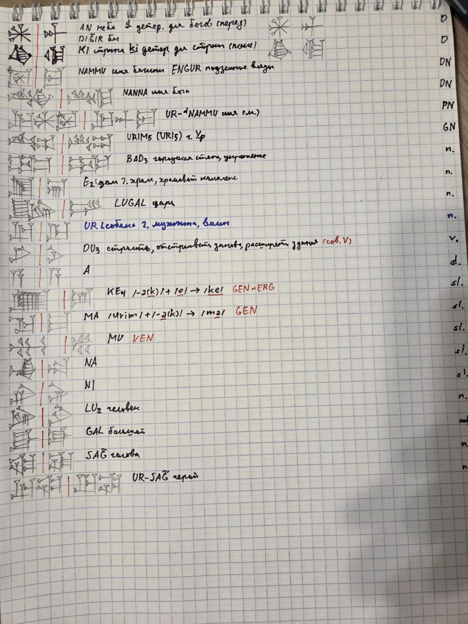 >>743799 После этого идет автограф текста для урока (табличка царя Ур-Намму в данном случае). Это очень древний стиль письма, более пиктографический, но первые четыре знака 𒀭 𒋀𒆠 𒈗 я смог разобрать самостоятельно.