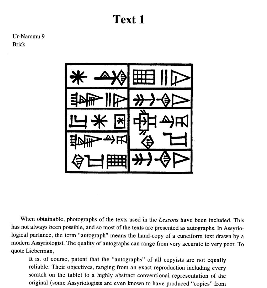 Решил попробовать позаниматься шумерским по 2 изданию A Manual of Sumerian Grammar and Texts by Hayes 2000 г. выпуска >>610419 (OP) (можно скачать на twirpx). В отличие от других учебников, в нем преподается клинопись.
