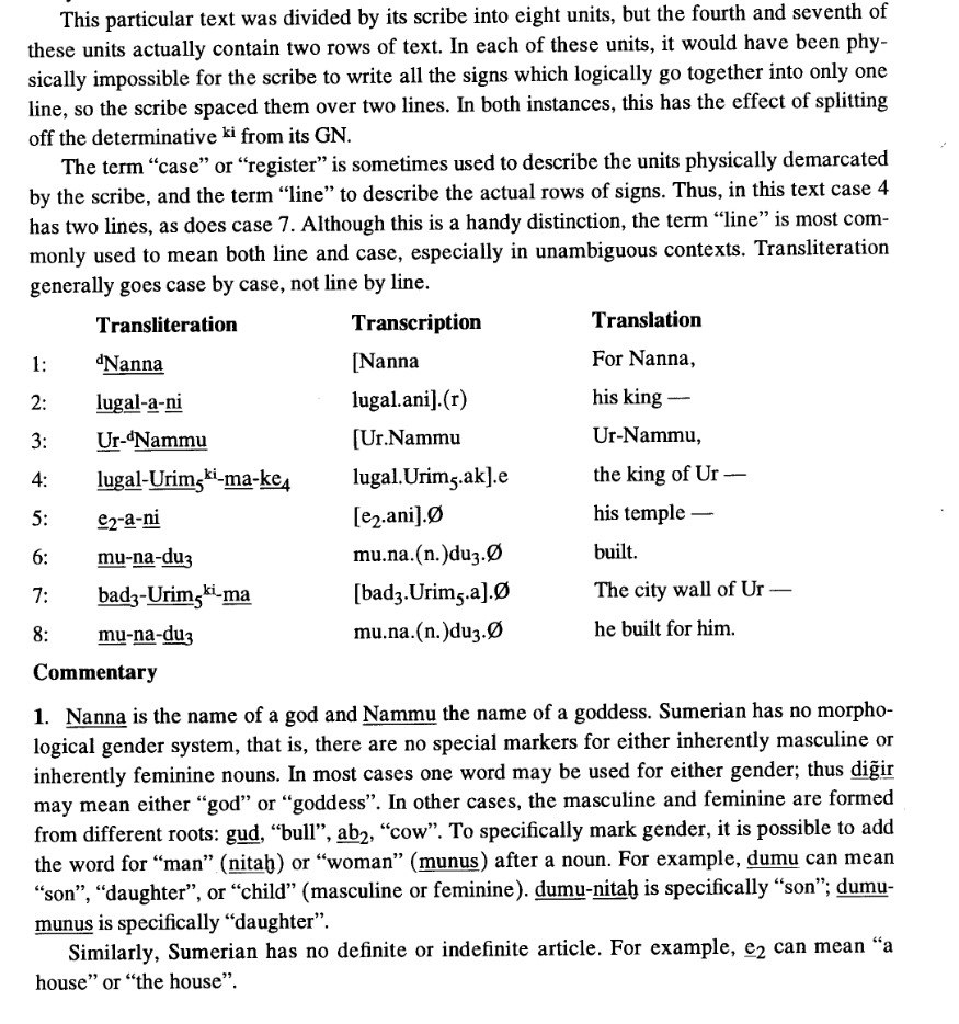 Насчет рода, кстати, в шумерском их два, одушевленный и неодушевленный. К первому относятся божества, люди (не все), статуи. Ко второму - все остальное + рабы (чаще всего) и коллективы людей (чаще всего). Род отображается только в использовании некоторых падежей и в глагольных аффиксах.