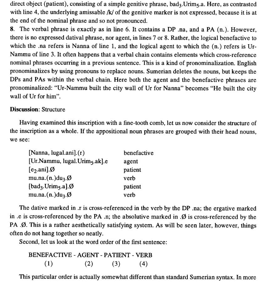 Также, благодаря эргативному строю языка, в шумерском отсутствует полноценные категории залога и переходности. Об этом расскажу попозже.