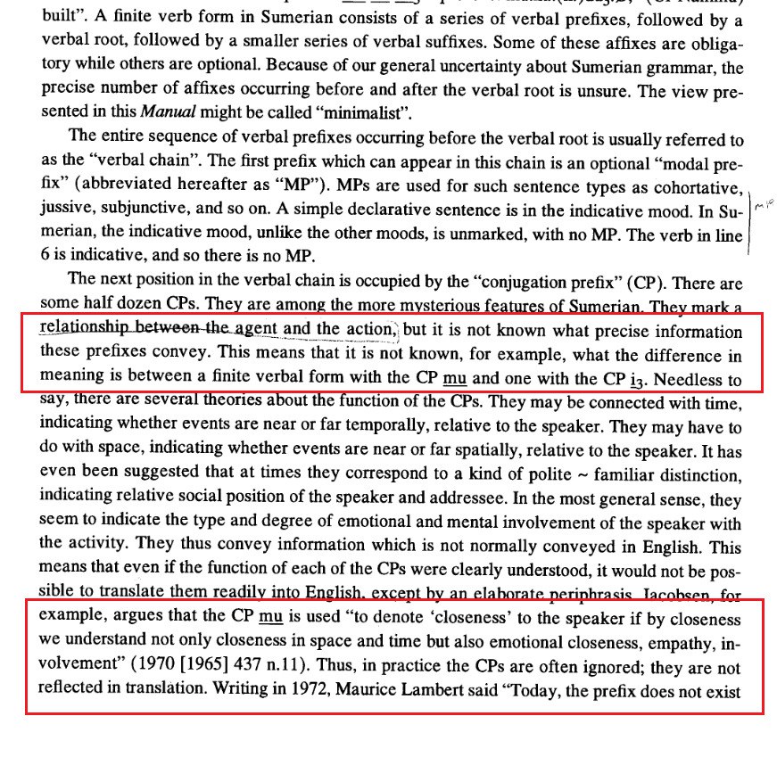 Т. к. учебник 2000 года издания, некоторая информация в нем была неактуальна. Например, про глагольный префикс /mu/ 𒈬 в глаголе не было четко указано, в чем его функция, просто говорилось, что предполагается, что он указывает на близость действия в пространстве
