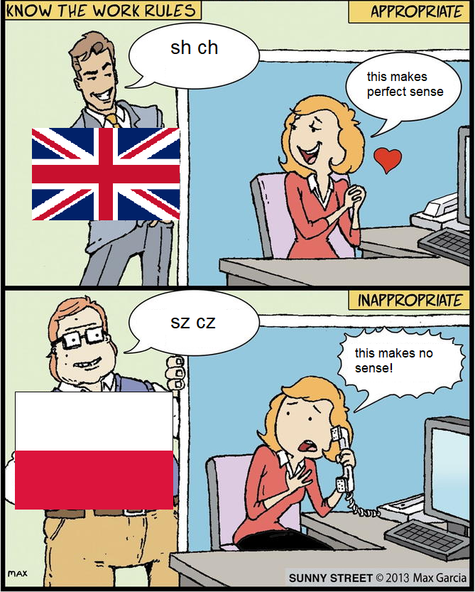 ż = ж rz = ж (да, опять две буквы обозначающие один звук) sz = ш ci = чи (в польском если после буквы "с" идёт "i", то читается как "чи", а не "ци") si = ши (аналогично) zi = произносится как звонкое щи, похоже на звук жи, только очень мягкий cz = тш (произносится слитно, как грубая буква ч) ć = ч (обычная русская ч) ś = щ (аналогично) k = к ch = к (то же самое, что и "ch") l = ль (в польском "l" всегда мягкий звук) ł = среднее, между л и английской w (лучше послушать этот звук, чтобы научиться его правильно произносить)