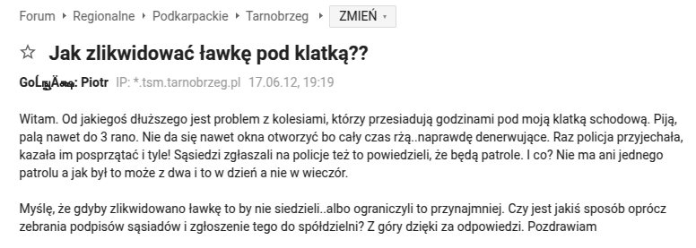 Myślę, że gdyby zlikwidowano ławkę to by nie siedzieli..albo ograniczyli to przynajmniej. Czy jest jakiś sposób oprócz zebrania podpisów sąsiadów i zgłoszenie tego do spółdzielni? Z góry dzięki za odpowiedzi. Pozdrawiam