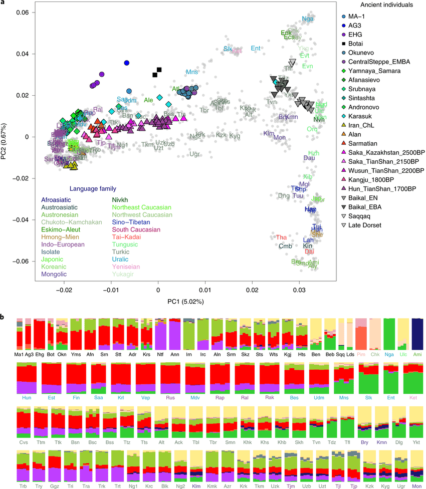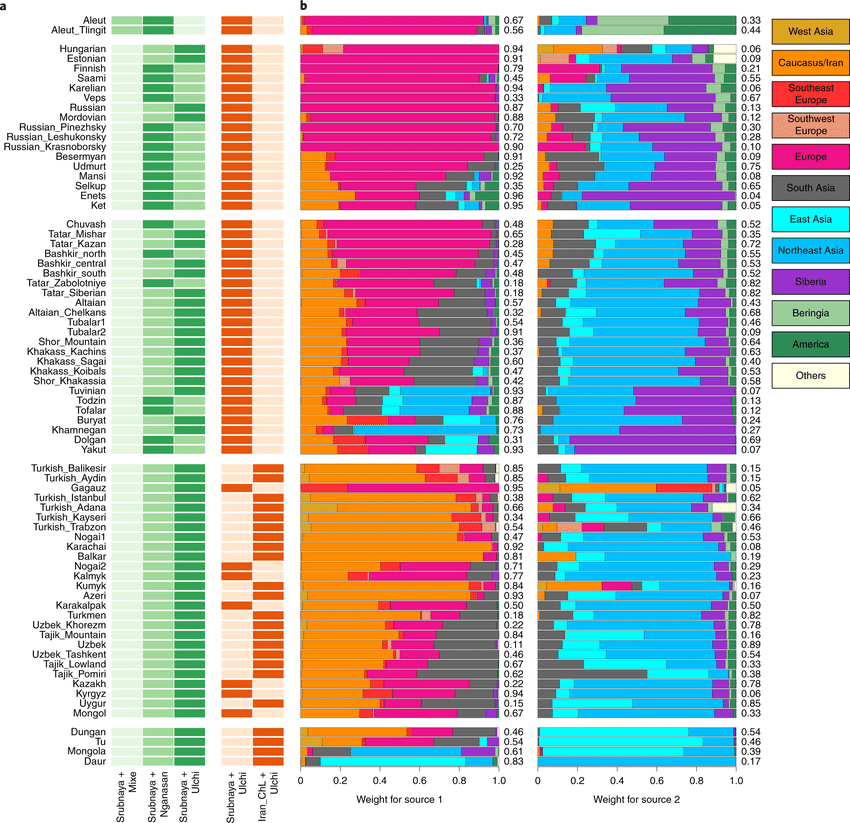 >>635644 На первой пикче: соотношение западно- (зелёный) и восточноевразийских (жёлтый) предков. На второй: разбивка обоих компонентов по регионам происхождения. На третьей: генетические расстояния (есть нормальный график, только с современными популяциями, но мне день искать): bsn и bsc - северные и центральные башкиры, которые ближе к чувашам с удмуртами и казанским татарам, - bss - южные, которые ближе к узбекам и сибирским татарам.