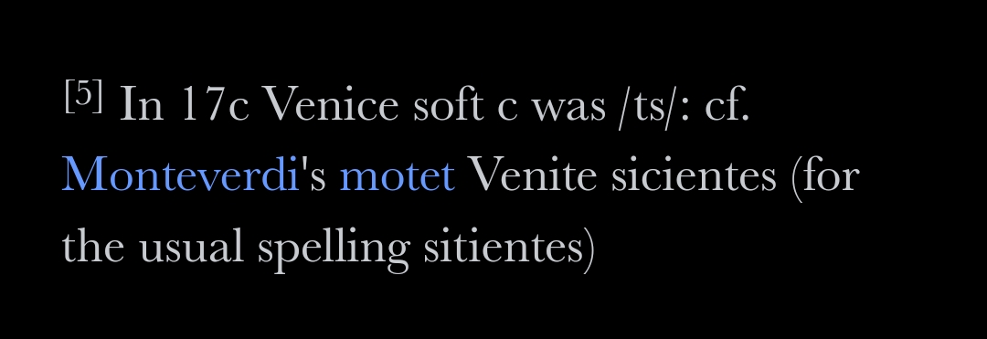 >>732311 Это да, еще известно, что в латыни ''c'' во всех позициях произносилось как ''к'', но у нас оно и в ''ц'' и в ''ч'' даже превращается. А v как ''у''(w) скорее. Но опять же - грустно, что на латыни написано очень много текстов, а людей, говорящих на нем, нет(даже новостей не послушать)