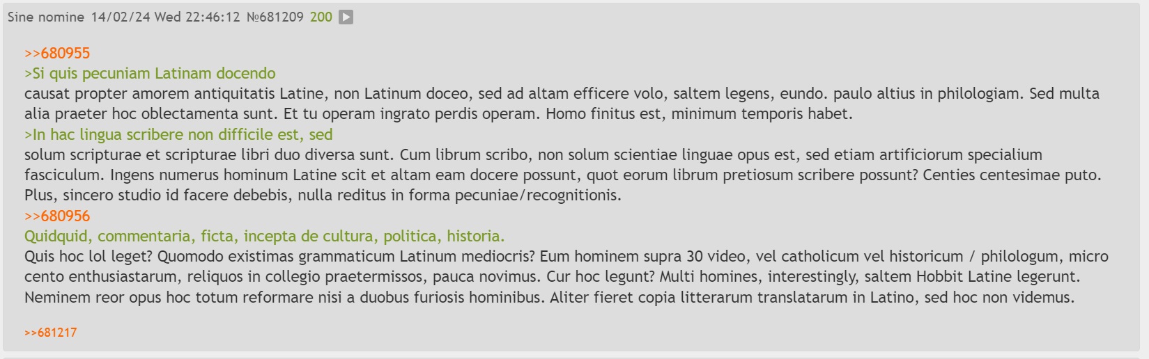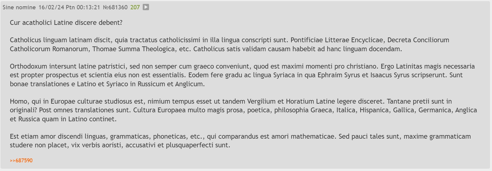 >Что может поколебать этот тренд? Какой тренд? У тебя конкретные пруфы в виде данных за 20-30 лет есть? Пара новых докладов на латыни погоды не сделают. Это специалисты достижениями меряются, у одних индекс Хирша, у других вот такое. А обществу плевать. Классических гимназий нет, потому что общественного запроса нет. Литературу на латыни в СНГ не издают. Контент на латыни не делают.