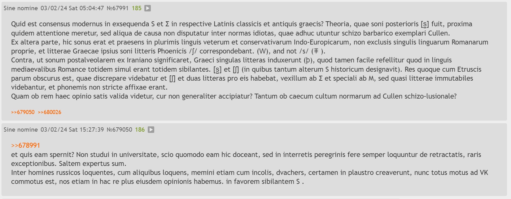 >>663504 >Приведи пример. Единственное, что мне в голову приходит, это что короткое с длинным не рифмовали, но это очень жидко. Да все латинское стихосложение (я имею в виду античность) только на долготах и основано, ударение там вообще роли не играет в общем-то (мб за исключением Плавта и сатурнова стиха, но это 1) архаика 2) спорные и не особо доказанные гипотезы.\ А рифмы в античном стихосложении как таковой в принципе нет, начала вроде появляться иногда в поздней античности, но вообще совсем не характерна. (Сразу видно, что о древних языках ты почти ничего не знаешь) >.А долгота какая-то - не унаследована (наверное, потому что её не было). Тоже мне аргумент, в праславянском тоже были долготы, а в русском их нет; то же с древне- и новогреческим etc. Языки имеют свойство меняться, и многие особенности праязыков выявляются не по наличию их в языках-потомках, а по каким-то косвенным следам. А уж с латынью все очевидно, ибо доступен и сам праязык.