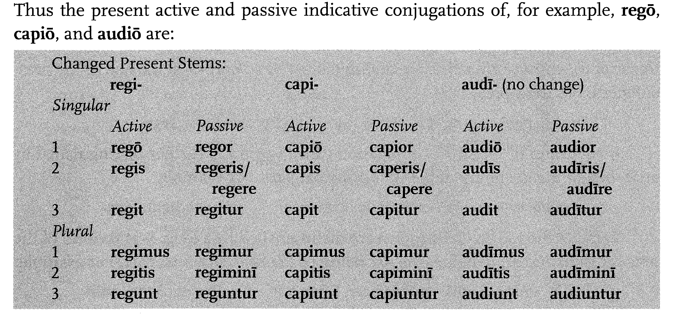 >>714704 Это подгруппа -io третьего спряжения. Здесь короткая i сохраняется, за исключением пассивного вокса второго лица сингулярис, где она меняется на короткую e.