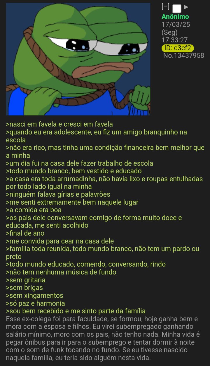 >>680487 (OP) Привет, аноны. Хочу учить бразильский, так как в глубине души надеюсь на перекот (да, я знаю, что там фавелы, преступность, будут грабить три раза в год, но мне похуй). Вот вопрос - где можно набраться ну каких-то прям минимальных знаний? У меня абсолютный ноль, нет ничего. Посоветуйте какой-нибудь самоучитель, учебник или курсы, по которым анону уже удавалось что-то усвоить. Предложений-то много, но я уже имею неприятный опыт общения с инфоцыганами и не хочу спускать деньги на хуиту типа ку-ку-курсиков. Поскольку больше никого не знаю - решил просто пойти и спросить она, он же всемудрейший, всё знает и за всё шарит. Помогите мне, /b/ратцы, пожалуйста.