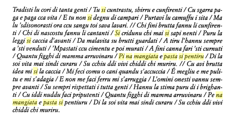 Cu avi brutta_idea mi si la caccia Mi faci comu o cani quandu s'accuccia È megghiu e me pulitu e mi s'adagia E non me (më) facciu ferru mi s'arruggia L'omini onesti vannu sempr'avanti Su sempri rispettati (rispëttati) 'i tutta genti Hannu la stima puru di i brighanti Cu iddi nuddu faci priputenti Quantu figghi di mamma arruvinaru Pi na mangiata e pasta si pentiru Di la so vita mai s'indi curaru Su cchiu ddi vivi chiddi chi muriru.