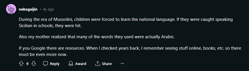>>740567 да смотрел видео как испанец в Палермо доебывал случайных прохожих на испанском, а они отвечали и в комментах люди писали что у испанского и сицилийского сходств больше чем у сицилийского и итальянского