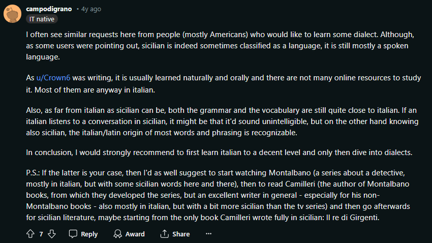>>680795 Не знаю. Популярных регионалов не так много: генуэзский, венецианский, неаполитанский, романеско, ну кому-то ещё из этрусководов нравится самобытный тосканский. Общий неизменно сольётся в хочу поучить итальянскей, но нет картачег. Перспективно покопать в сторону Сан-Марино, эмилиан-романьольского, смешанных диалектов.