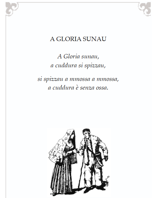Quattordici anni a mia mi cundannaru Senza ca fazzu nenti vi lu giuro All'isula di scuntu mi portaru Chiusu nta na stanza sempre oscura Chiddu chi mi accusaun dè fici strada Mi si poti pigghjari la me zita Non ma pozzu sperdirinta jurnata Si campu e nesciu ci cacciu la vita Na grazia a mia mi fici lu signuri El'isula mi pozzu jeu scappari Mi travestia di milli culuri Un jornu mi lu pozzu capitari Ejji alla ricerca ppe mari e munti E quandu l'uncuntrai a stu briganti Tirai lu mitra en ci sparain tu fruntie La sua sposa me la fici amanti