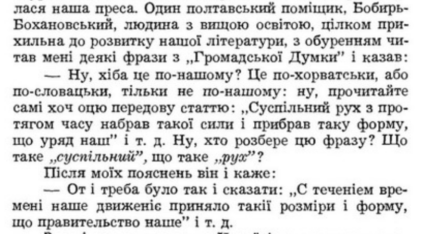 Но и люди образованные, например, полтавский помещик Бобир-Бохановский, по словам Чикаленко, жаловался ему на выдуманный язык «Громадської думки»: «Хіба це по-нашому? Це по-хорватськи або по-словацьки, тільки не по-нашому: ну, прочитайте самі хоч оцю передову статтю: «Суспільний рух з протягом часу набрав такої сили і прибрав таку форму, що уряд наш і т. д. Ну, хто розбере цю фразу? Що таке «суспільний», що таке «рух»?