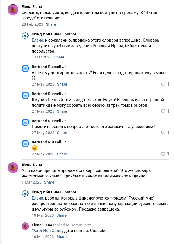 Несколько лет назад в издательстве "Наука" вышел первый том "Большого персидско-русского словаря" Иванова, он был в свободной продаже. Затем вышел второй том в другом издательстве, но продавать его нельзя, потому что идите нахуй, вот почему, мы тут русский язык(????) популяризуем, хуй вам, а не словарь.
