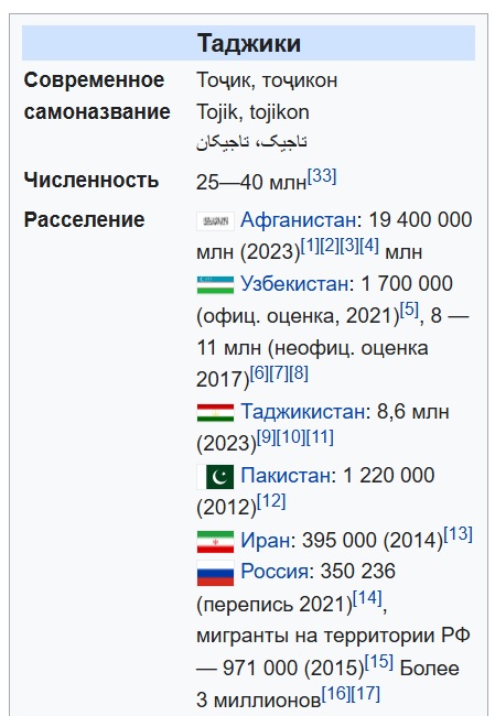 >>714450 В Узбекистане официальная оценка ближе к реальности, в максимальную оценку включены так называемые сарты. В ходже раннесоветского размежевания границ в Средней Азии этот народ упразднили и заставили назваться либо узбеком, либо таджиком (при том, что это были оседложе городское население, этнически смешанное и массово двуязычное, то есть критерии причисления к тем или другим очень зыбкие). В Афганистане еще проще - все фарсизычные автоматически записываются в таджиков чисто по языковому признаку (а почему не в персов, например?).