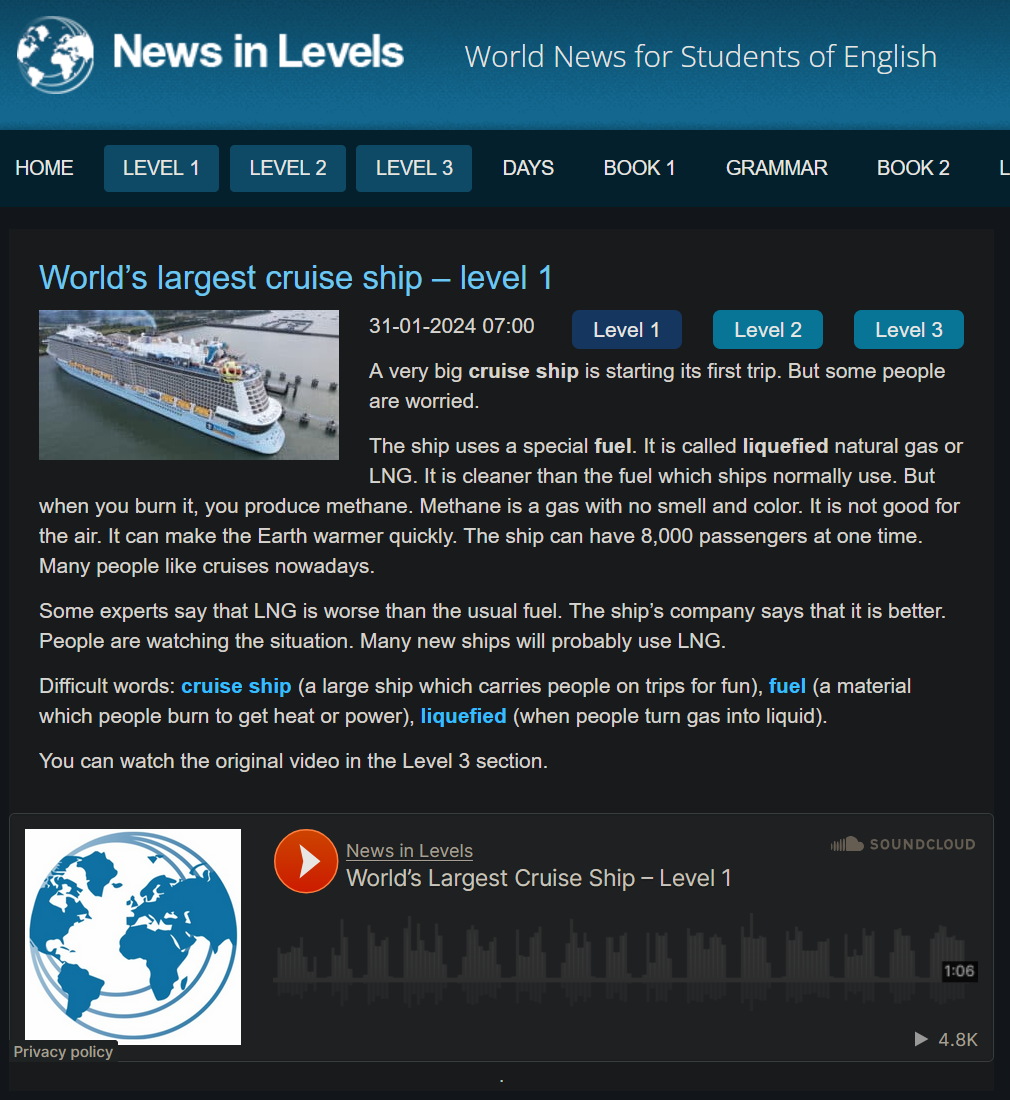 Но из всего этого пула учеников, есть такие, которым слова сложно даются. Четверо. Двое из них до сих пор у меня учатся, уже несколько лет. Хотя видно, что стараются вполсилы. Может, потому что они - занятые люди. Но прогресс есть, хоть и медленный. Им тяжело даже адаптированного Робинзона пересказывать. Для них я старался найти текст поменьше и попроще, например сайт https://www.newsinlevels.com/.