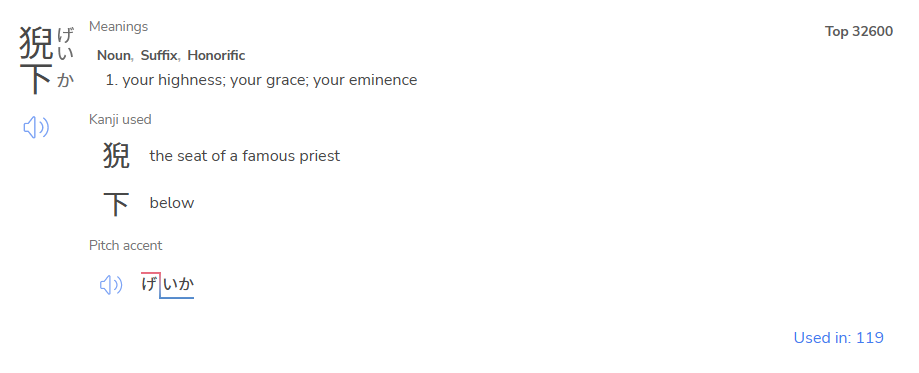 >>727538 >Или это распространённое и мне просто не попадалось? А как ты еще будешь корабли считать? Ну есть еще 隻, но это только для всяких линкоров и прочей крупноты, а у тебя на пике мелкая лодчонка. >я уже повидал все вариации "вашего высочества" А эти видел? 台下・聖下・座下 >>727544 Ну справедливости ради, в одном из яп-яп есть помимо всяких высокопоставленных монахов замечание про 碩学 (せきがく) に対する敬称, то есть если там чел какой-нибудь суперэрудит ученый, то годится.