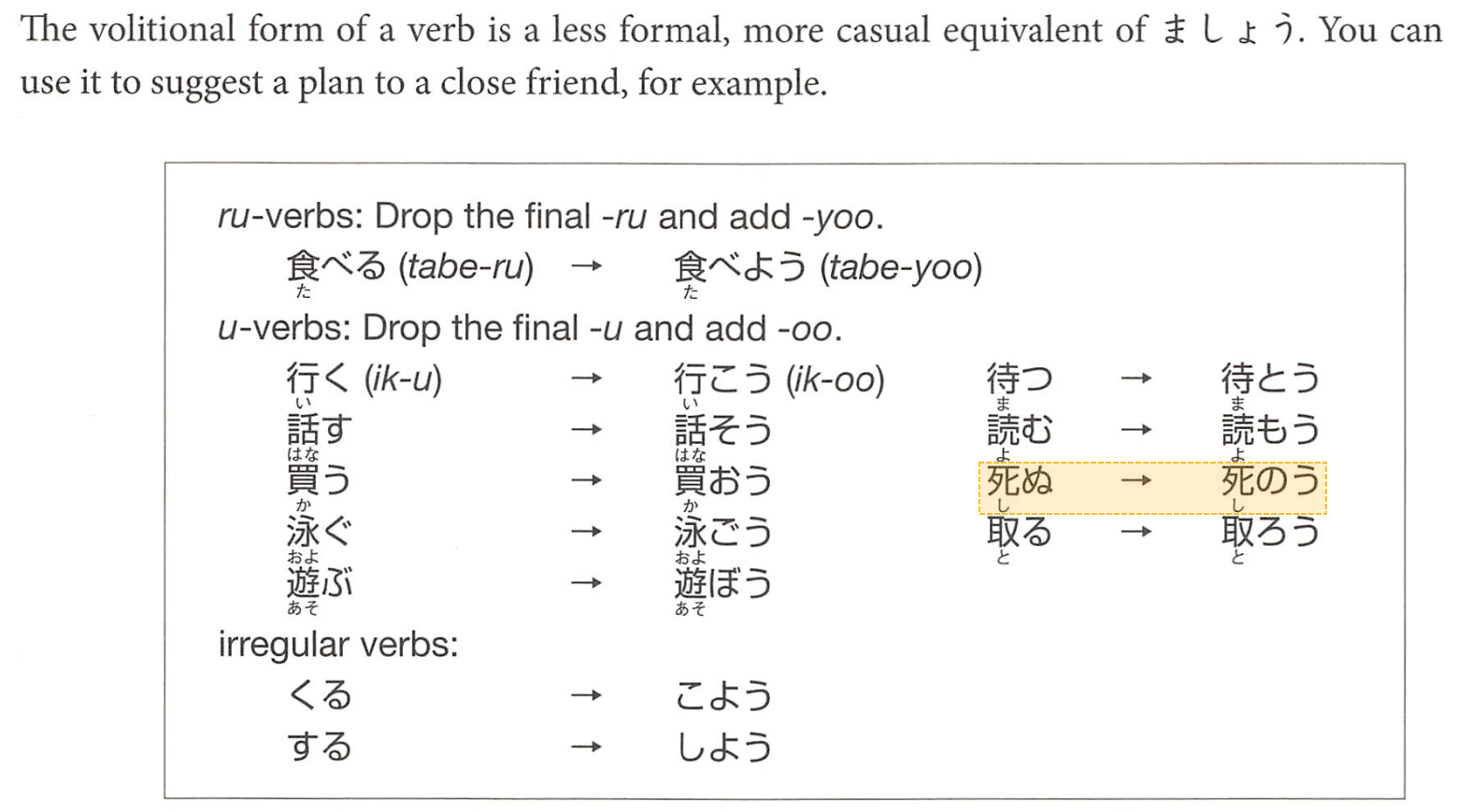 Но тому пику есть логичное объяснение: учебник должен научить спрягать глаголы, и так исторически сложилось, что в современном японском используется только один глагол на ぬ – 死ぬ. Так что выбора какой использовать для примеров нет. Даже для волитивной формы (пик 2).