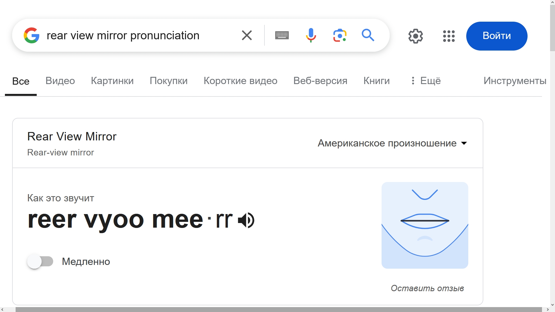 >>729917 >получается какая-то мешанина из звуков Вся эта фраза должна звучать как одно слово из трёх слогов с двумя ударениями. Набери в гугле 'rear view mirror pronunciation' и послушай.