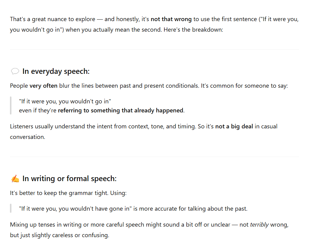 >>729402 То есть в 99% случаев для нативов даже не будет разницы, использовать ли паст симпл или презент перфект, они в этом скорей всего и не увидят ошибки. Но если строго по учебнику, то окажется, что нативы говорят "неправильно". Это меня и смешит, что учебник указывает нативам, как им говорить, а они, упрямые заразы, не слушаются, не читают учебников.