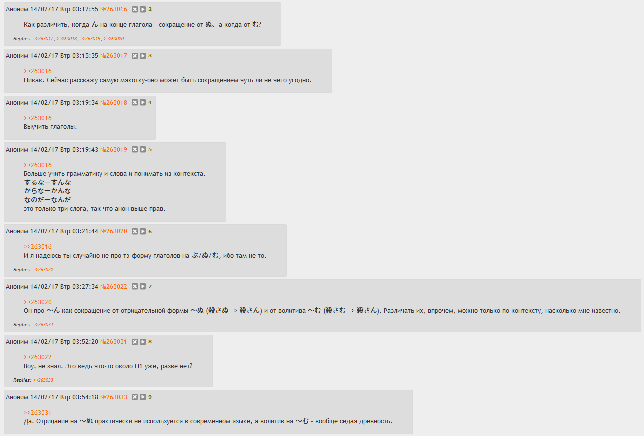>>731244 >а в примерах обычно не стесняйтесь 遠慮なく А в языке нет, используется во всех формах. >Я сам это недавно узнал Потому что твои примеры фигня, настоящего языка не нюхал.