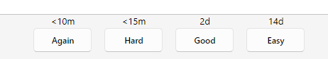 >>731252 Вообще еще аддон есть, он меняет все эти кнопки на две всего fail\pass, но лично мне не нравится тем, что она очевидно изичных картах, где я могу увеличить интервал выбрав изи, там выдается интервал как на гуд. Но есть и свои плюсы, думать не надо, либо вспомнил либо нет.