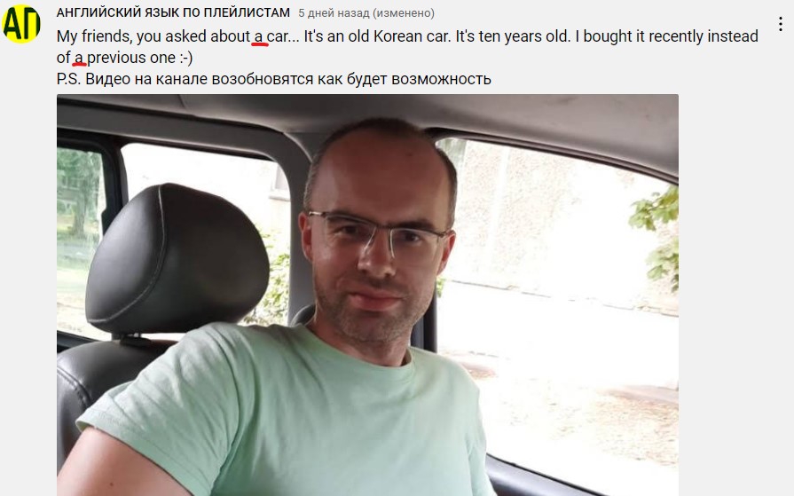 >>731419 Там или my или the нужен потому что машина уже упоминалась, но никак не a. Да и в целом написано так что выглядит как словарный перевод. Какую-то машину купил вместо другой, другую не купил.