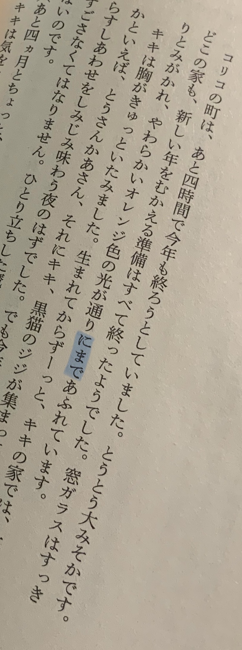Дочитана первая глава Новые слова: へちゃら、ばんそうこう、くすりと、消毒、よその子、寝押し、パン種 Про はいはいしている нужно глянуть русский/английский перевод, чтобы понять, наверное. 細くてもきんと光っている - как я понимаю きん это 金, и перевести можно как «хоть и тонкий, но светящийся золотом» Ну и в ахуе с того, как Кики подбили, конечно. Ну хоть метлу второй раз не поломала и на том спасибо
